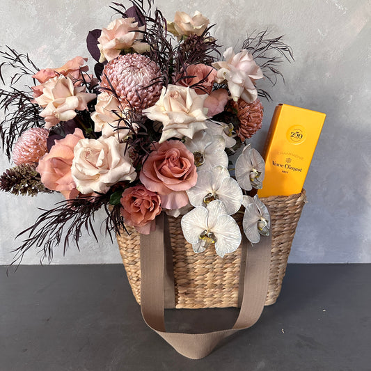 • A stunning "Picnic of Love" arrangement from Flowers on Norton St features a basket filled with pastel roses and orchids, paired with a yellow Veuve Clicquot champagne box, ready for your picnic date. This lovely composition is set gracefully on a dark surface against a gray backdrop.