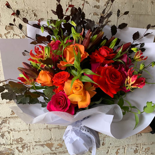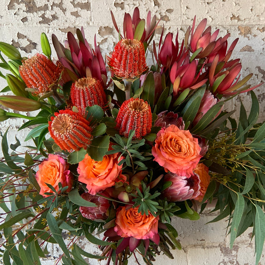 • Introducing the "Eora Sunset Natives + Rose Bouquet" by FlowersonNortonSt, a vibrant floral display that showcases burnt orange roses, red protea, and assorted greenery against a textured white brick wall. This stunning arrangement combines colorful blooms with lush foliage, featuring native wildflowers for an elegant and charming effect.