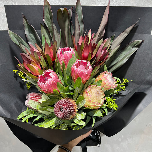 • Introducing the "Australiana" by FlowersonNortonSt—a stunning bouquet showcasing an array of Australian wildflowers. This vibrant arrangement features pink proteas, orange and yellow banksias, and red leucadendrons, beautifully intertwined with orchids and eucalyptus, all complemented by lush greenery set against a light background.
