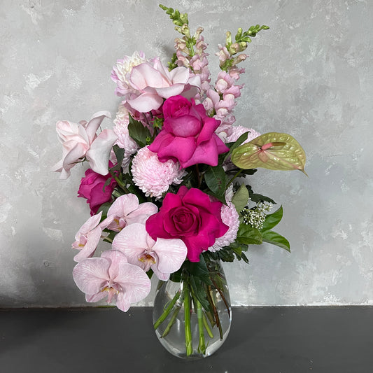 • The Bedside Rose + Orchid Vase from Flowers on Norton St showcases a vibrant bouquet of pink roses, white orchids, and lush greenery set against a textured grey background.