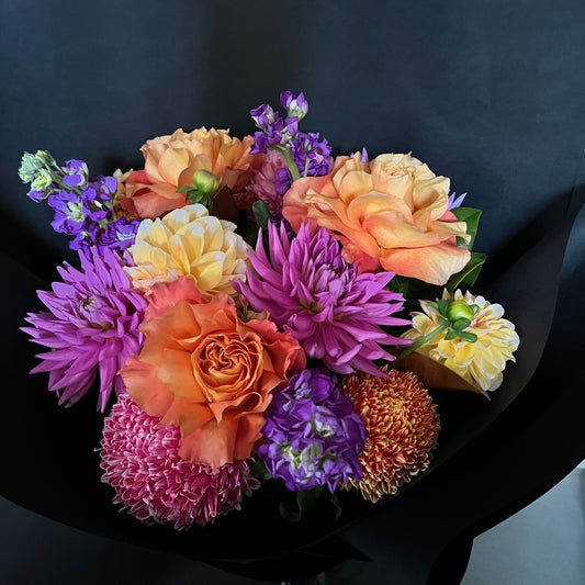 • Introducing the Winter Warmer Posy Bouquet by FlowersonNortonSt: a vibrant arrangement of orange roses, purple chrysanthemums, and yellow dahlias, beautifully contrasted against a striking black backdrop.