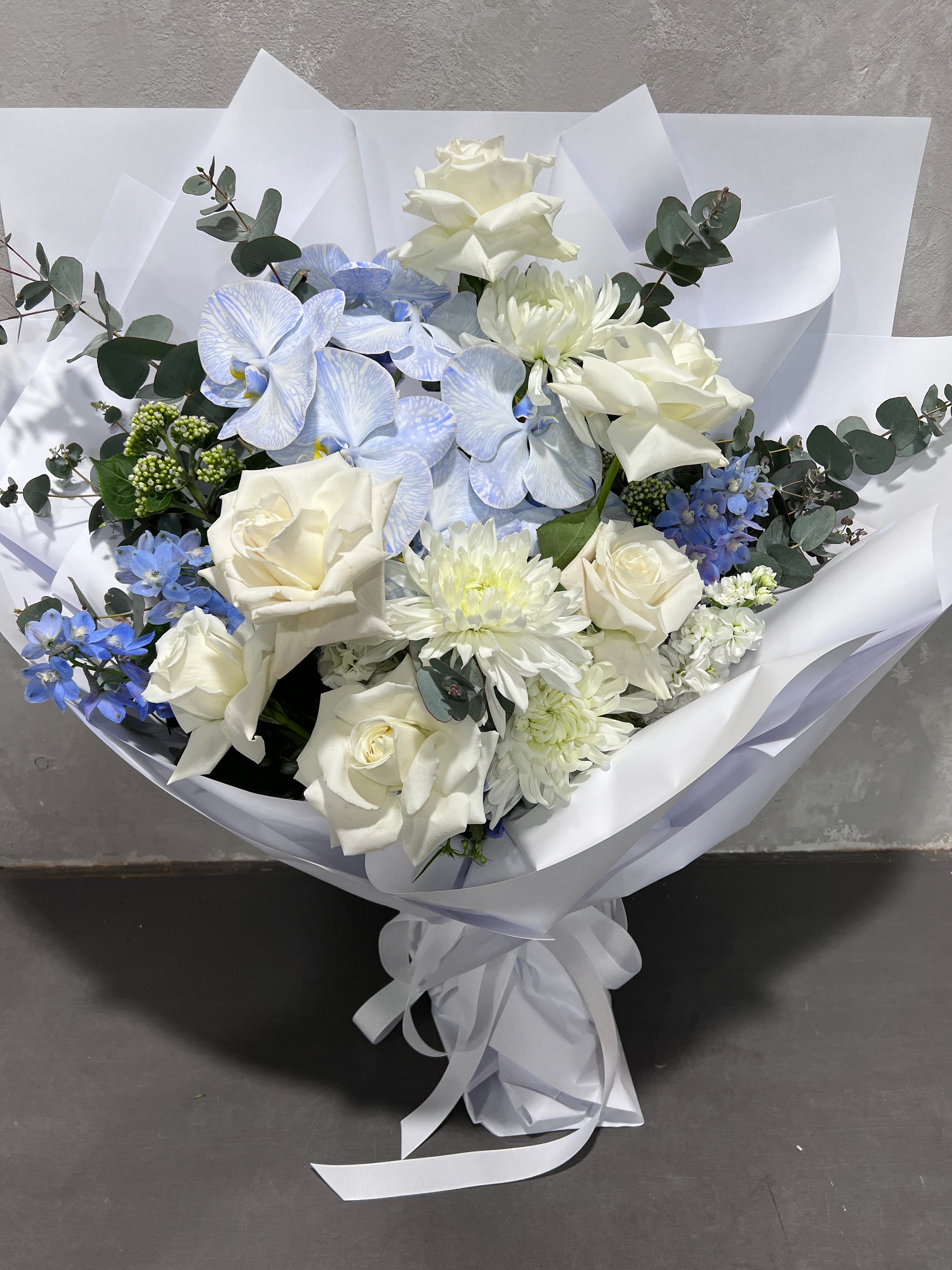 Blue Daze- A petite version of our signature Botanicals range, these bouquets combine unique blooms and contemporary styling in the perfect package.Ā