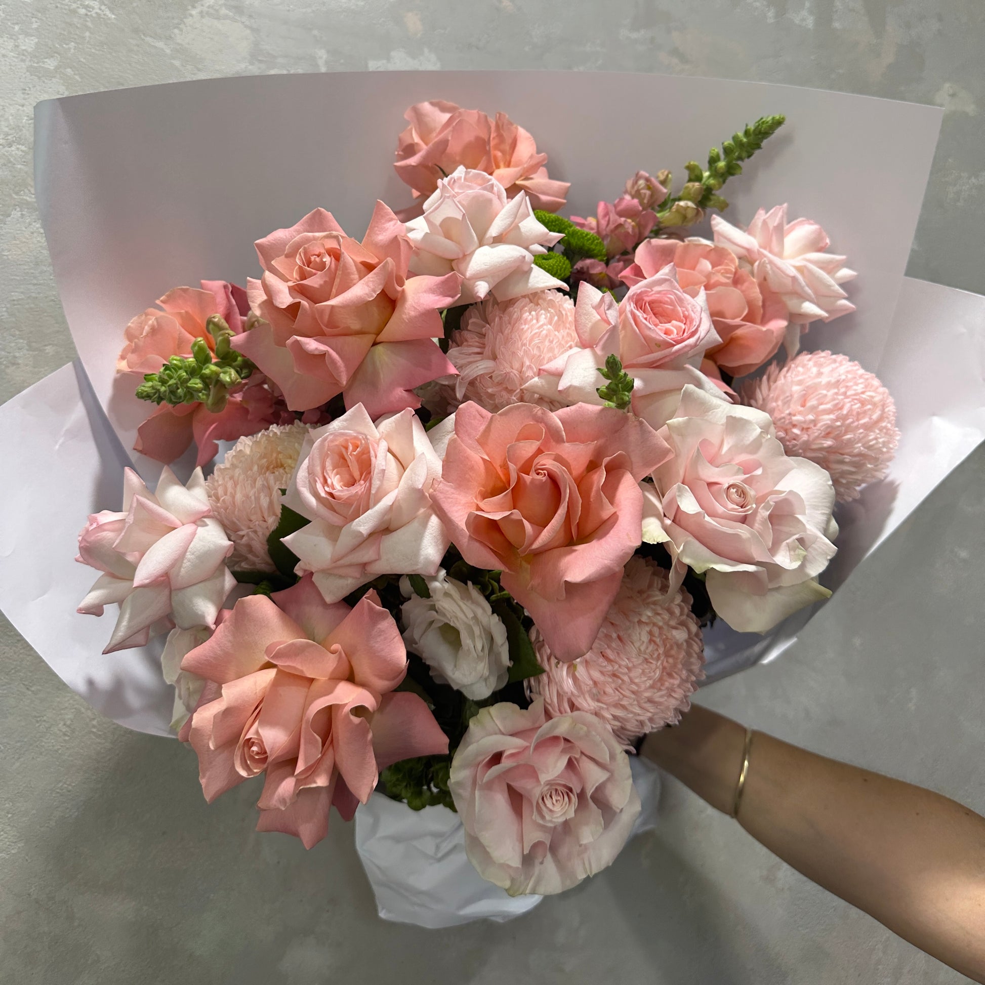 A soft and romantic bouquet designed in the prettiest shades of blush and pink. Featuring a dreamy mix of seasonal blooms, this bouquet feels light, joyful and full of affection. Sweet without being over the top, it’s the perfect way to say I adore you.