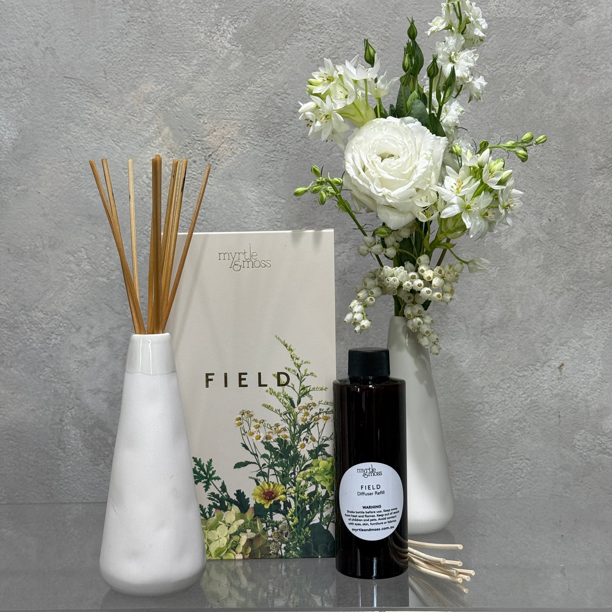 The Myrtle & Moss Flume Diffusers offer a subtle, natural fragrance that enhances any space. Once the scent fades, the elegantly designed vase can be repurposed as a bud vase or refilled to extend its use. Please note, flowers and refills are sold separately. Ideal for those seeking a sophisticated, botanical aroma rooted in Australia's unique flora. Crafted with botanically inspired natural and essential oils.