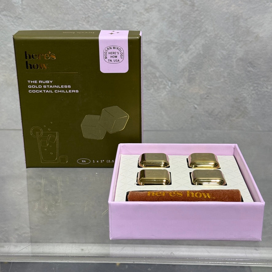 The Ruby Gold Stainless Cocktail Chiller ensures your drinks stay perfectly chilled without dilution. This expert-designed set includes four freezable stainless steel cubes that maintain ideal beverage temperatures while preserving flavor integrity. A sleek storage pouch provides practical convenience for storage and transport. To maintain durability and performance, hand wash the cubes only.